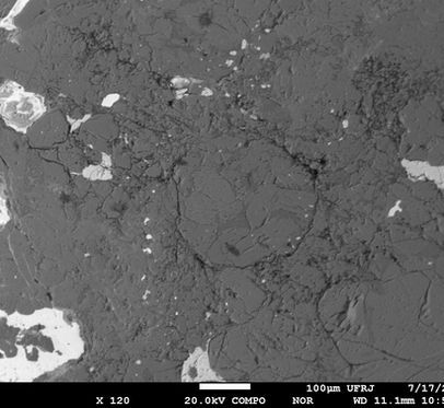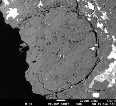 Under optical microscope, two thin sections were analyzed and showed Ubá as an unbrecciated ordinary chondrite containing a light mm-sized clast set within brownish-gray host with generally readily discernible equilibrated chondrules. Composed predominantly of orthopyroxene, olivine, FeNi metal (kamacite), troilite and interstitial albitic feldspar (<50 µm). Minor Ca-rich pyroxene (pigeonite and augite), taenite, and tetrataenite phases occur. Dark and light regions were observed with the same petrologic texture exhibiting a low shock stage S1 to S2 due to the presence of sharp and undulatory extinction of olivine and presence of Newman lines in kamacite. Troilite is essentially unaltered and most metal is fresh with few oxidized grains (W1).
